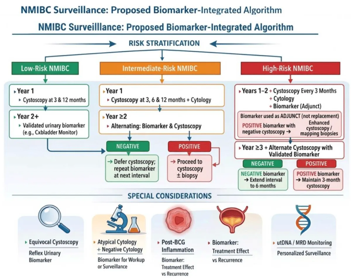Bladder cancer is the 10th most prevalent malignancy worldwide, with approximately 75% of cases manifesting as NMIBC [1]. The hallmark of NMIBC is its proclivity for recurrence, with up to 60% of patients experiencing recurrence within the first year of diagnosis [2]. Current guidelines from the NCCN, AUA/SUO, and EAU mandate meticulous cystoscopic surveillance at intervals determined by risk stratification, ranging from every 3 months for high-risk disease to annually for low-risk disease [3,4]. This surveillance paradigm imposes a substantial burden on patients and healthcare systems alike.